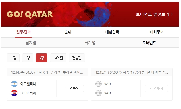 2022 카타르월드컵 4강 진출팀이 확정 됐습니다. 아르헨티나 대 크로아티아의 경기부터 12월 15일 목요일 오전 4시에 열리는 경기도 중계 합니다. 전력분석 및 예상스코어까지 모두 확인 할 수 있습니다.